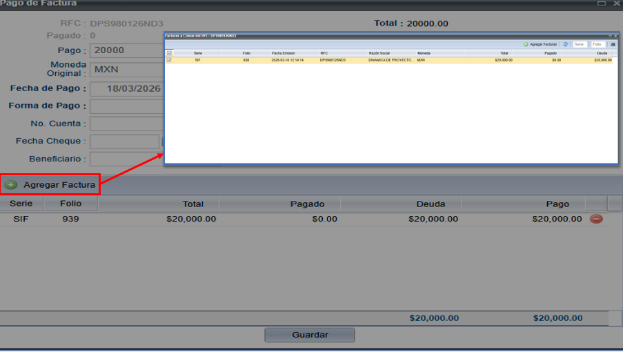 Esto abrirá la ventana de Pago de Factura, donde podrás capturar la información del cobro.