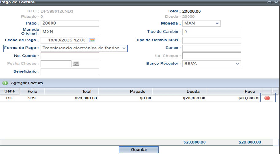 Una vez capturada la forma de pago, da clic en el botón Guardar para finalizar el registro.